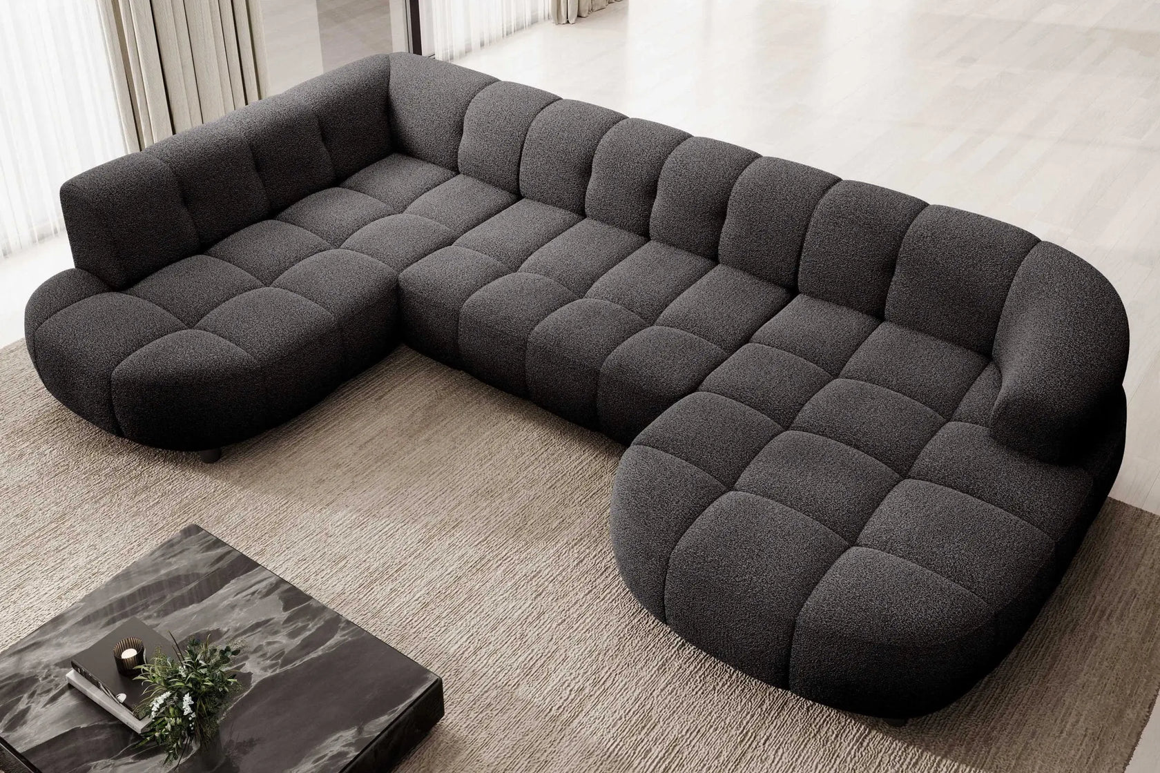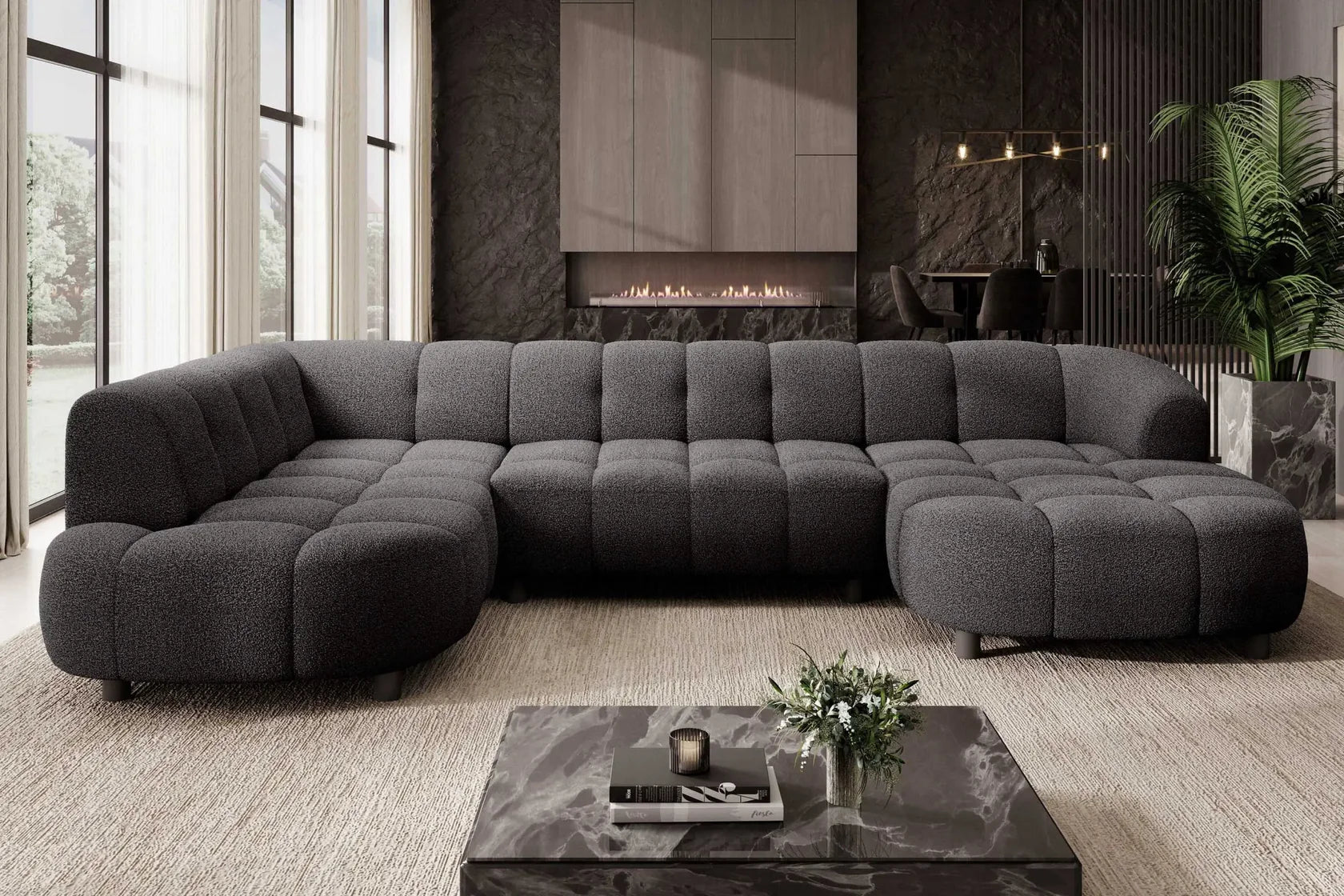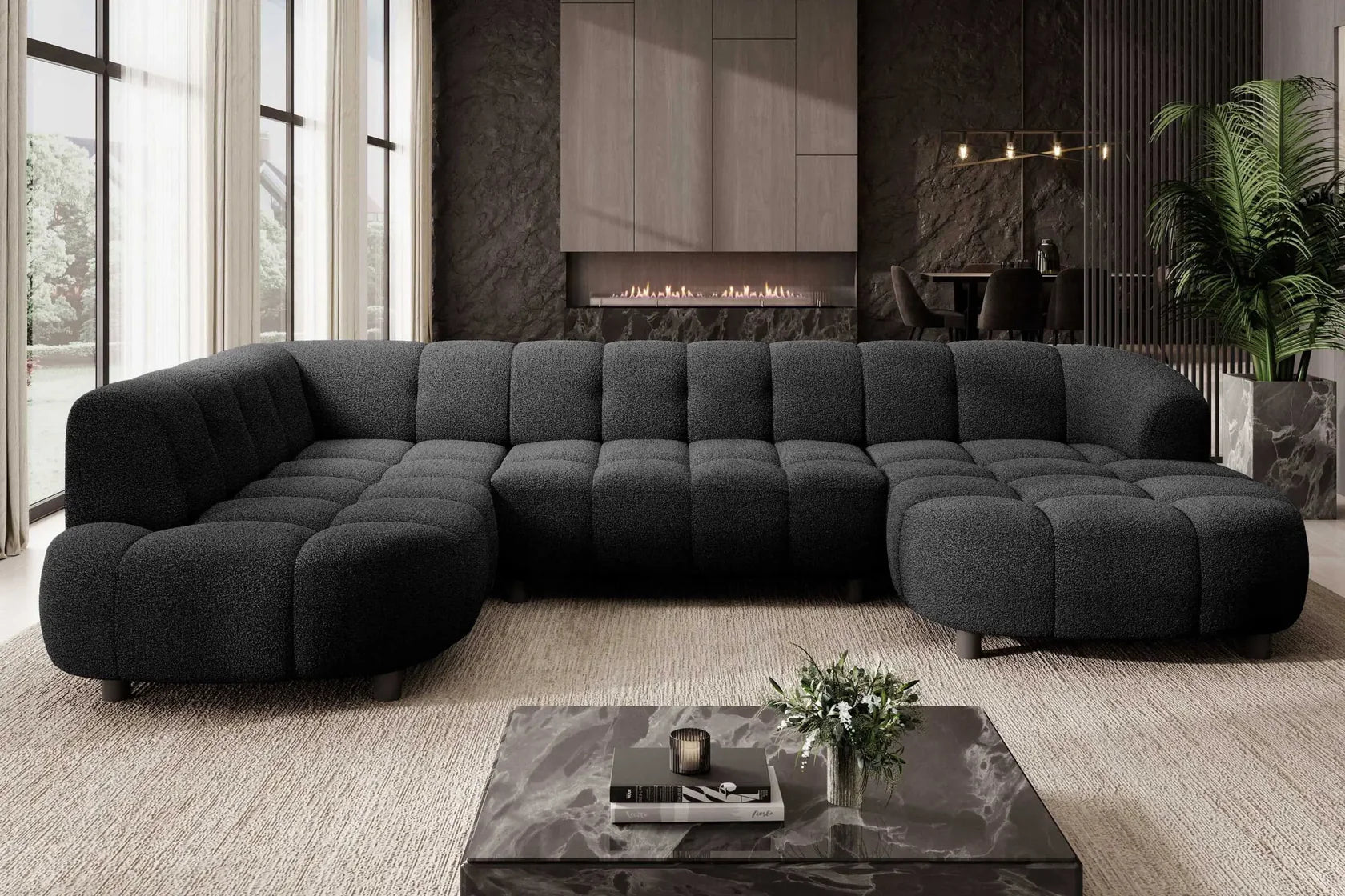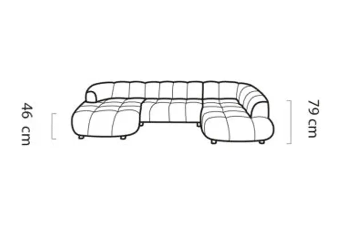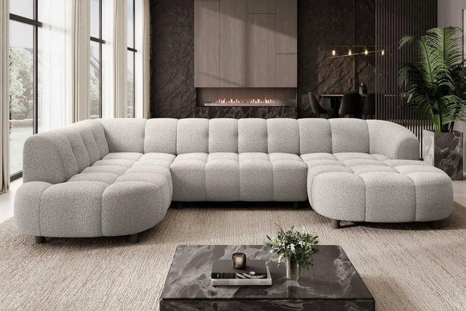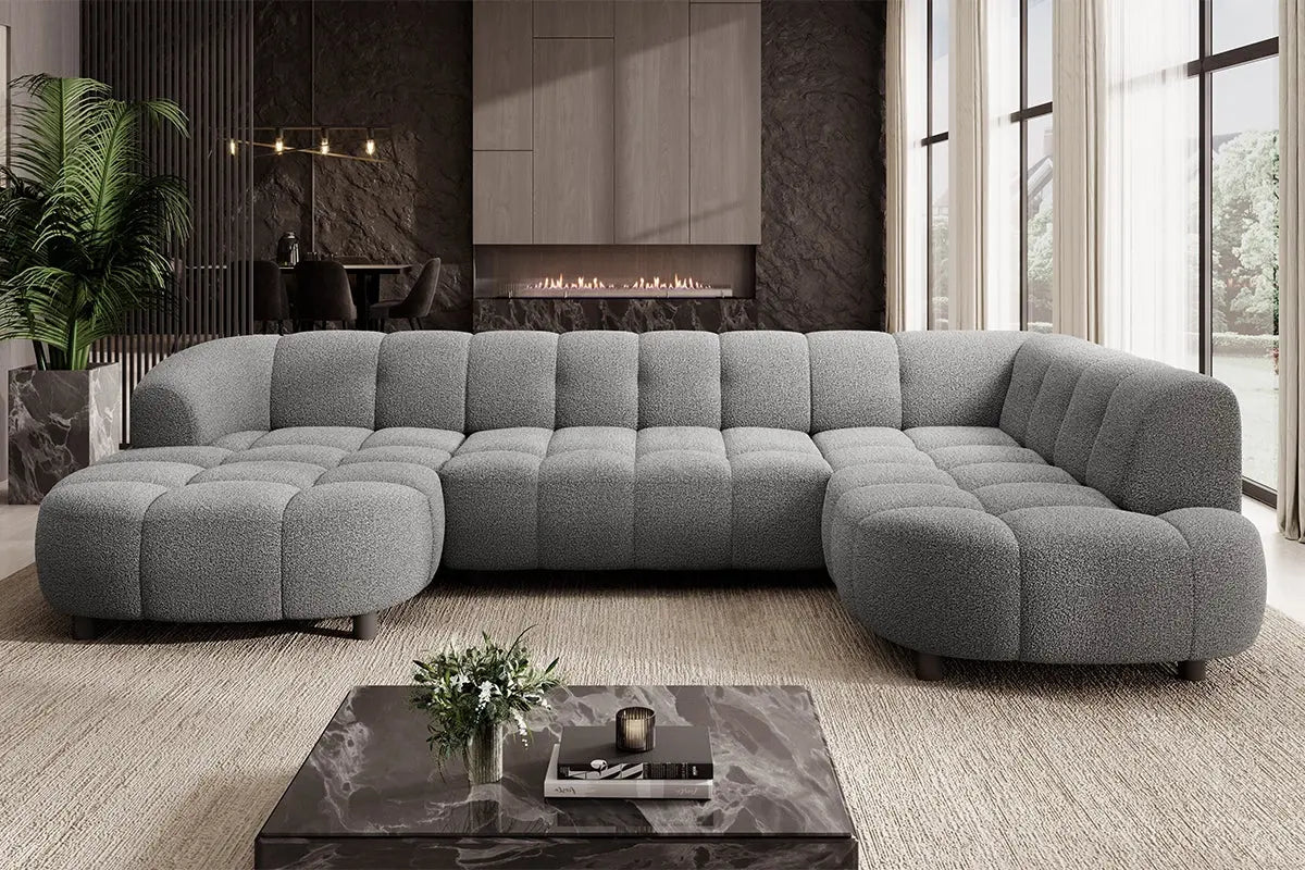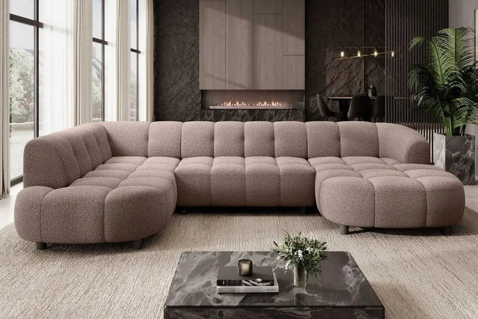 • Design Panoramique et Élégant : Avec sa forme en U, ses accoudoirs design et ses pieds hauts en métal noir, le canapé VELPA XL affiche une esthétique moderne et sophistiquée malgré ses dimensions généreuses.