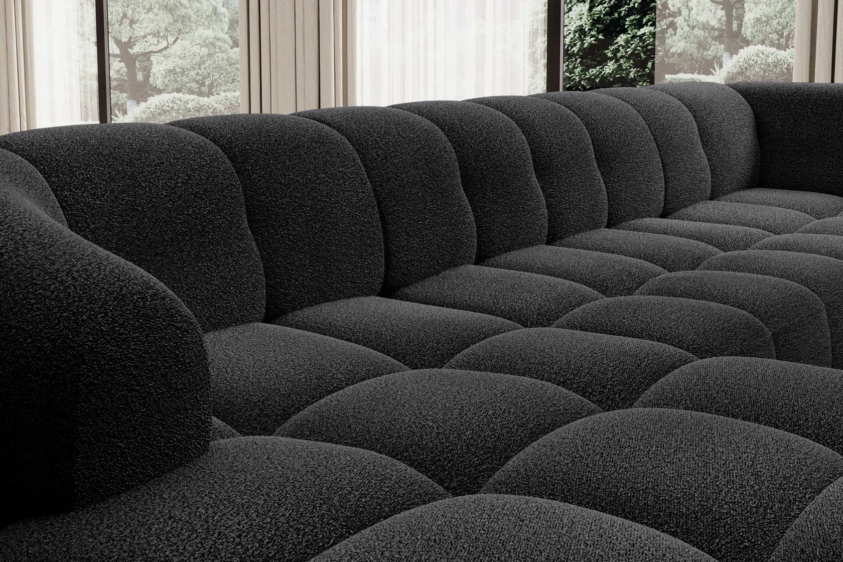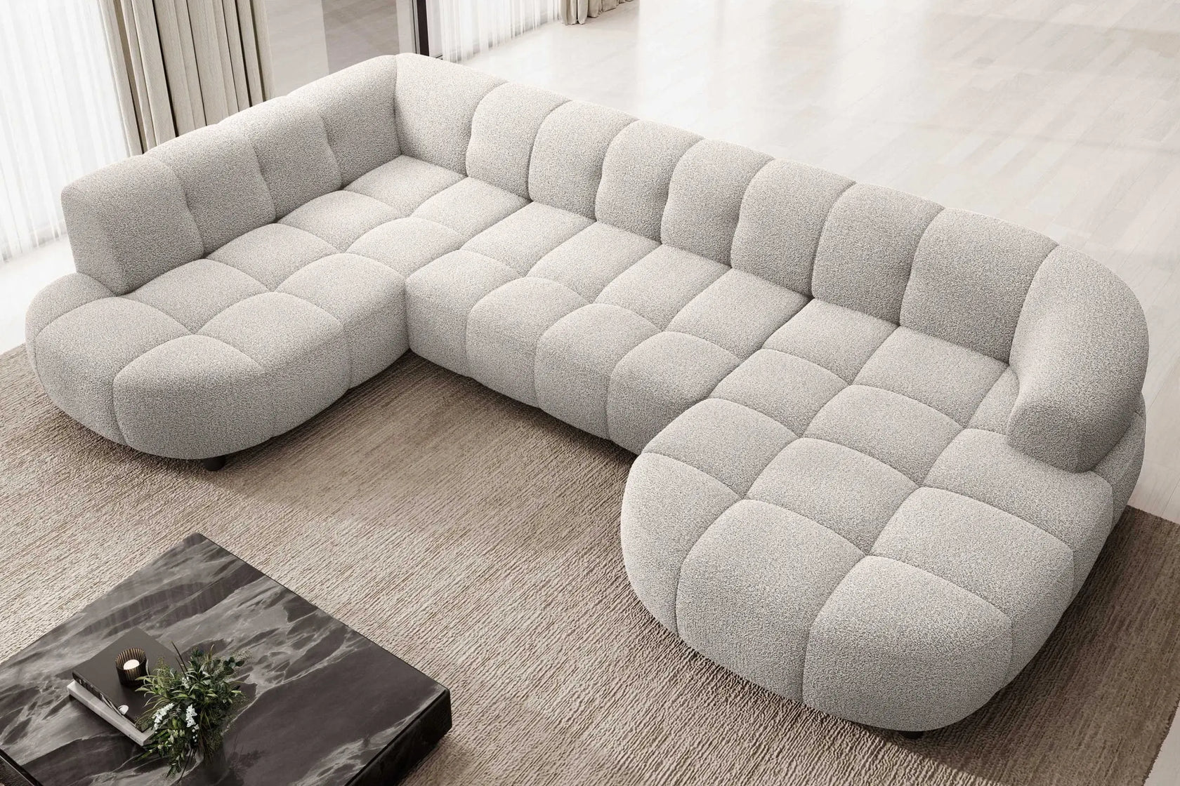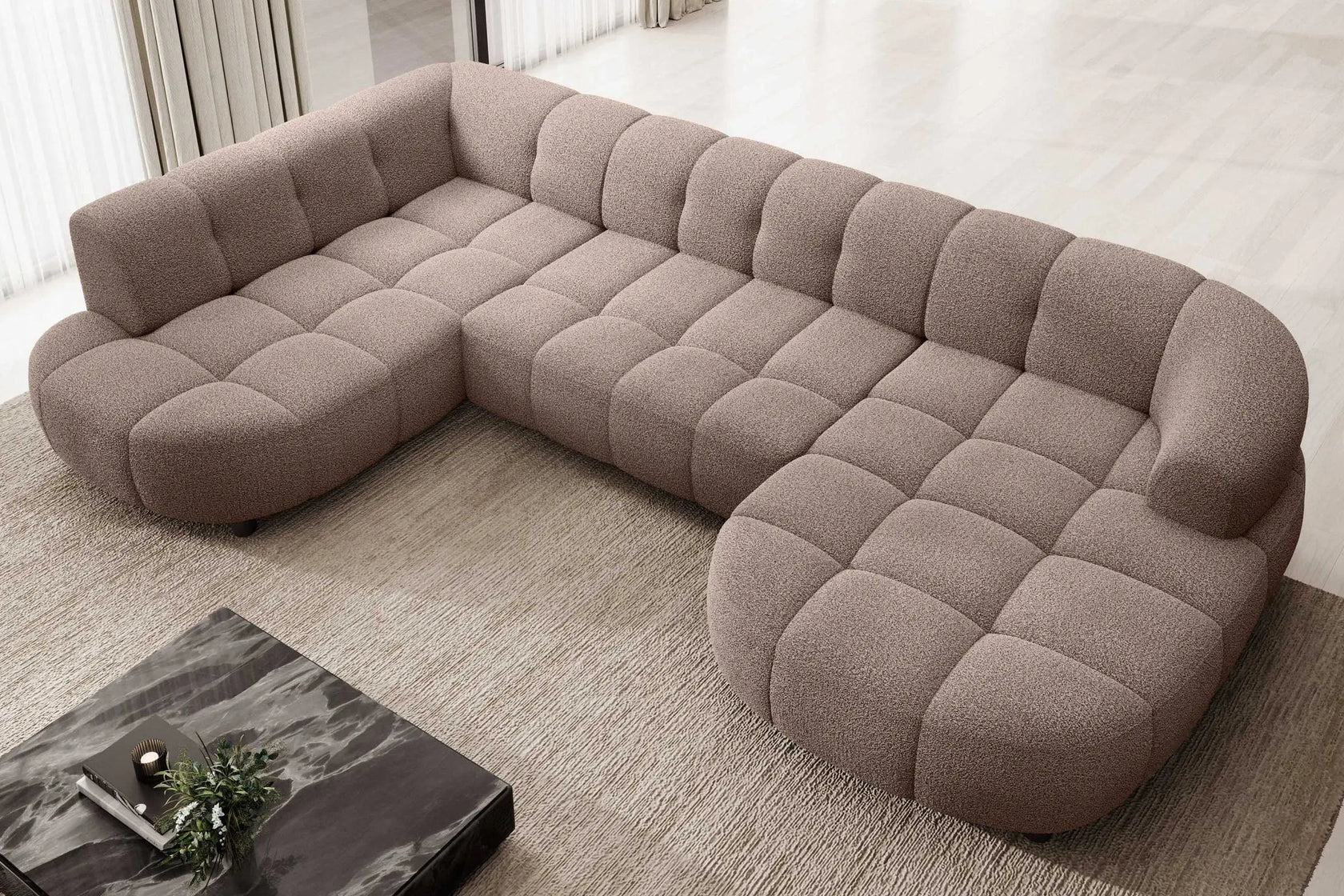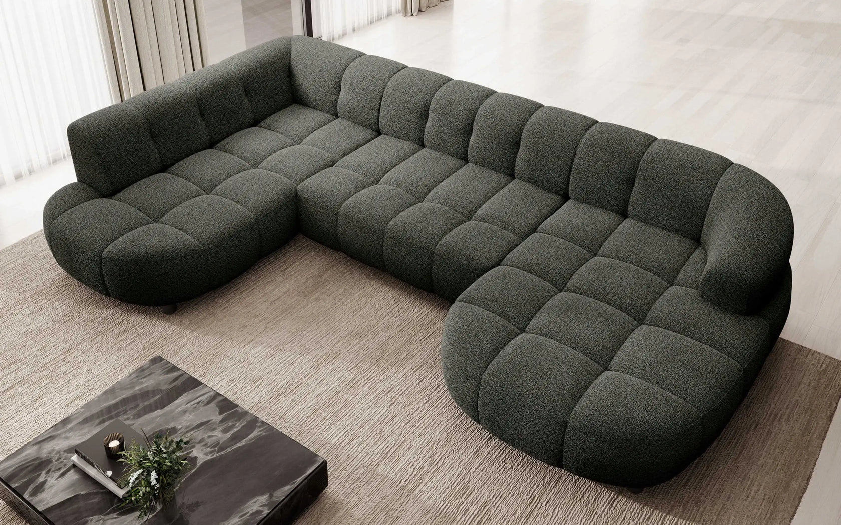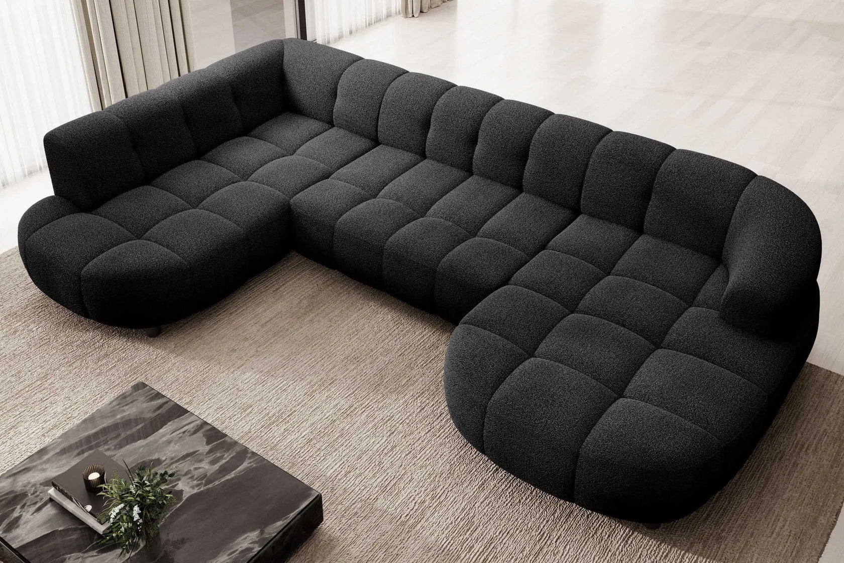 • Design Panoramique et Élégant : Avec sa forme en U, ses accoudoirs design et ses pieds hauts en métal noir, le canapé VELPA XL affiche une esthétique moderne et sophistiquée malgré ses dimensions généreuses.
