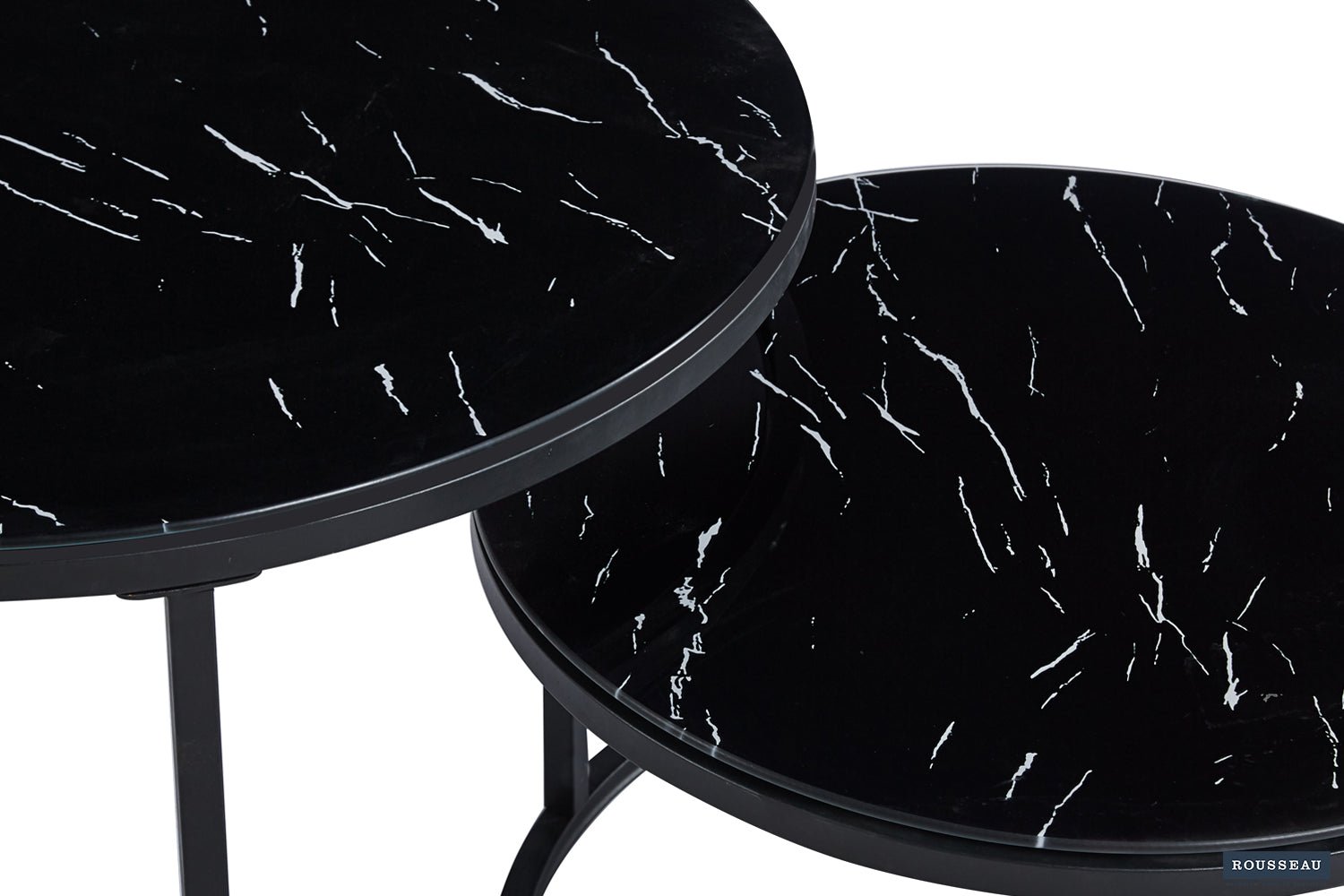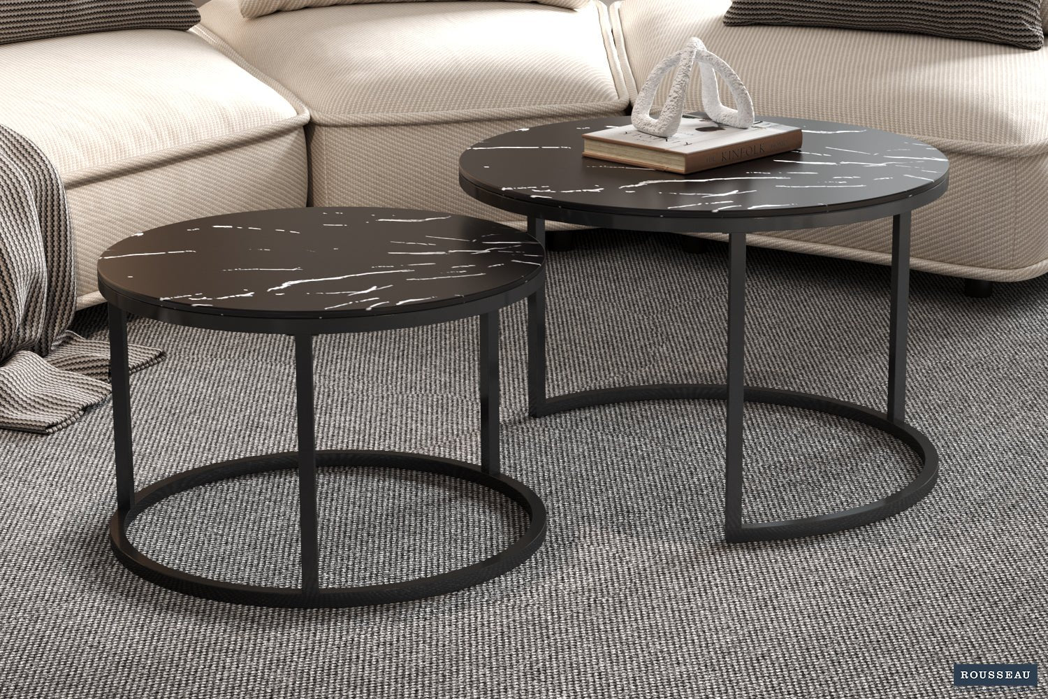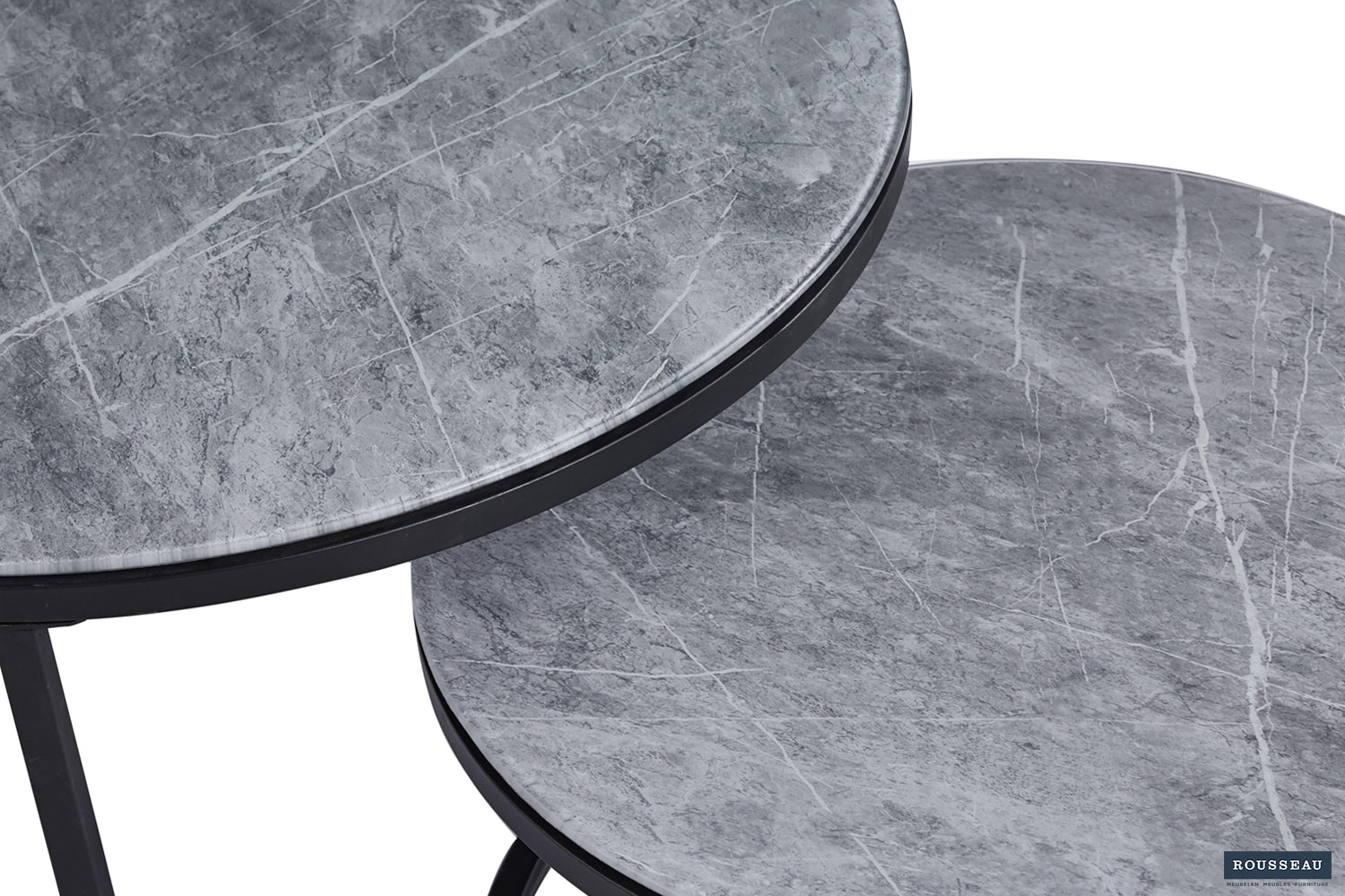 Les plateaux sont fabriqués en verre décoratif avec motif marbré, alliant esthétisme et facilité d’entretien. Le piétement est en métal revêtu de poudre noire, offrant robustesse et stabilité. Ces tables se distinguent par leur design épuré et leur capacité à s’intégrer harmonieusement dans un intérieur contemporain.