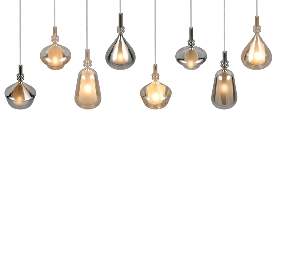 Mix de Verres Décoratifs : L'alternance des nuances en verre chromé (effet miroir et moderne) et en verre couleur ambre (lumière chaude et vintage) crée un contraste visuel dynamique et une diffusion de lumière variée.